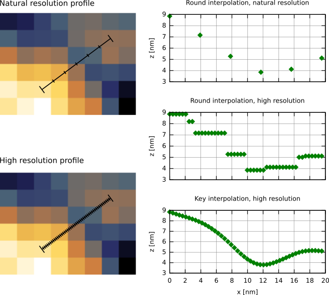 Illustration of data sampling in profile extraction for oblique lines. The figures on the left show the points along the line where the values are read for natural and very high resolution. The graphs on the right show the extracted values. Comparison of the natural and high resolution profiles taken with Round interpolation reveals that indeed natural-resolution curve points form a subset of the high-resolution points. The influence of the interpolation method on values taken in non-grid positions is demonstrated by the lower two graphs, comparing Round and Key interpolation at high resolution.
