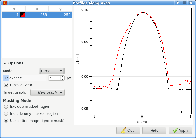 Инструмент извлечения профилей вдоль осей извлекает линии сканирования вдоль горизонтального и/или вертикального направления. Направление управляется опцией режим, которая может быть задана как варианты горизонтальный, вертикальный или крестовой. В режиме креста оба профиля извлекаются одновременно.